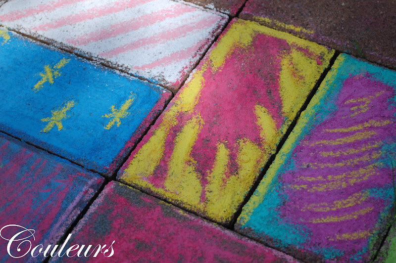 Comme il faisait beau (comme il a fait beau toute la semaine passée), les enfants ont joué dehors plus que regardé le hockey (ce qui n'est pas sans rappeler la dernière fois, au match final de la coupe). Les filles se sont mises à dessiner avec de la craie et j'ai trouvé le résultat assez joli.